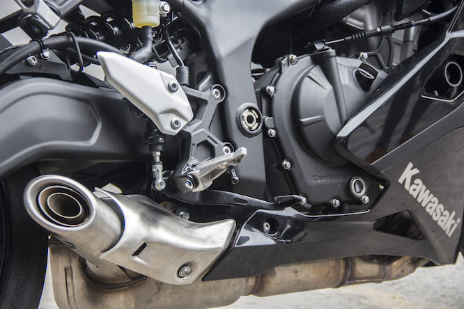 Trang bị phía sau của ZX-25R 2020 là phanh đĩa đơn có đường kính 220mm. Ống xả đơn đặt thấp, bên dưới gắp sau. Kawasaki ZX-25R 2020 phiên bản tiêu chuẩn vừa được đưa về nước không được trang bị phanh ABS.