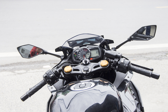 Điểm nhấn phía trước xe là các đường cắt xẻ táo bạo. Đèn pha LED cùng định vị ban ngày hình tam giác. Đèn xi-nhan báo rẽ dạng halogen truyền thống. Đây được coi là đối thủ nặng ký của mẫu Honda CBR-250RR.