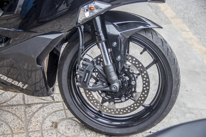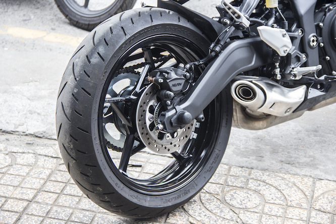 Tiếp đến là vành xe 17 inch ở cả bánh trước và bánh sau. Tuy nhiên, lốp sau có kích thước lớn hơn giúp xe vận hành tốt hơn. Hệ thống treo trước loại hành trình ngược, phanh đĩa đường kính 310 mm.