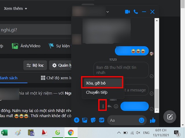 Bước 4: Tại phần tin nhắn thu hồi, bạn chọn biểu tượng dấu ba chấm dọc. Lúc này menu hiển thị tuỳ chọn Xoá, gỡ bỏ.