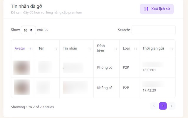 Bước 8: Ngay lúc này, bạn sẽ được chuyển đến trang Tin nhắn đã gỡ. Tại đây bạn có thể xem lại những tin nhắn mà mình đã thu hồi. Trong trường hợp bạn muốn xoá vĩnh viễn những tin nhắn này, bạn chọn Xoá lịch sử là xong.