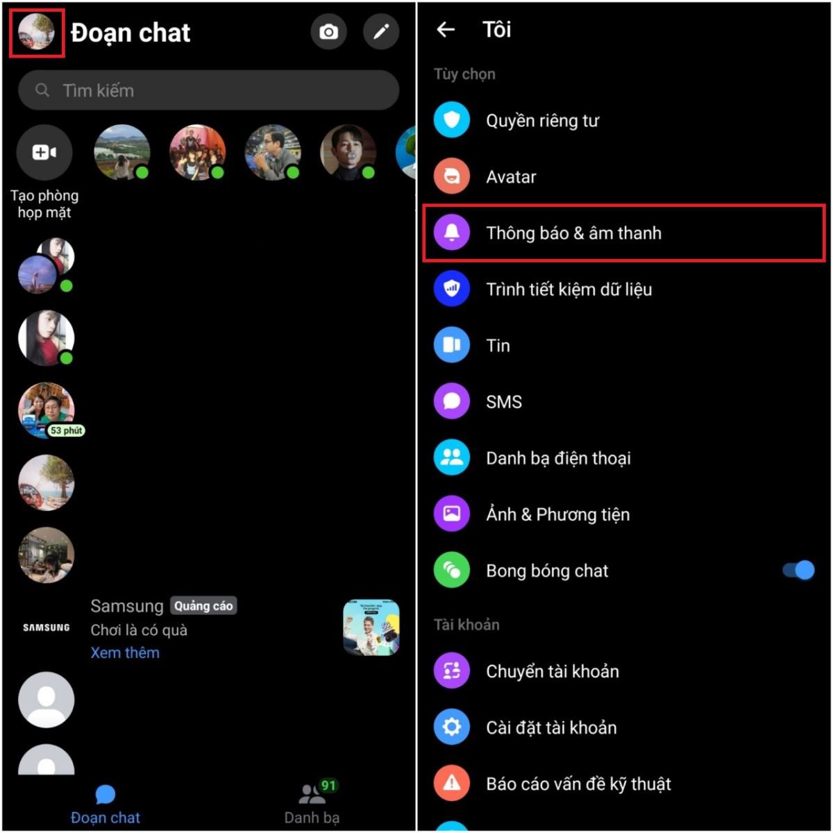 Bước 1: Để cài đặt lại nhạc chuông cho Messenger, đầu tiên bạn nhấp vào biểu tượng của ứng dụng Messenger trên màn hình điện thoại. Tiếp theo chọn biểu tượng hình đại diện ở góc trái màn hình -> Chọn mục Thông báo và âm thanh.