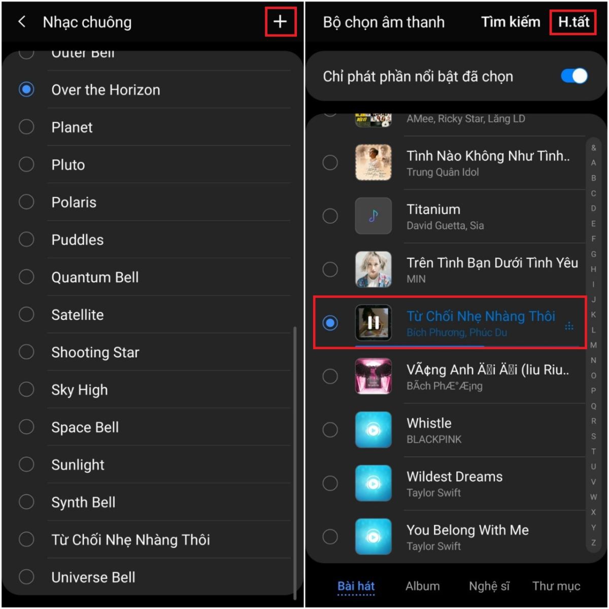 Bước 5: Cuối cùng bạn nhấn vào biểu tượng dấu cộng -> Tìm đến bài hát mà mình thích -> chọn Hoàn tất là xong.