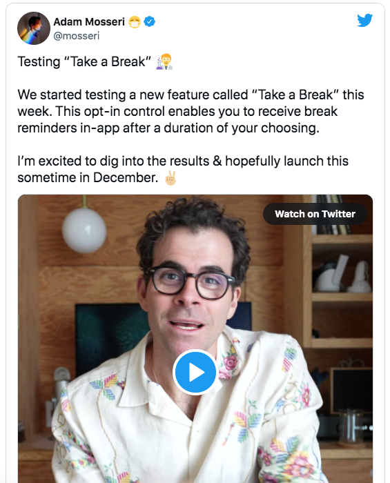 Người đứng đầu Instagram, ông Adam Mosseri thông báo rằng công ty đã bắt đầu thử nghiệm một tính năng mới có tên “Take a Break” để giúp người dùng kiềm chế cơn nghiện Instagram và khuyến nghị họ nghỉ ngơi sau một khoảng thời gian nhất định trên ứng dụng.