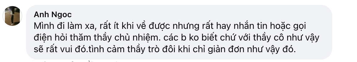 Facebooker khác như Chung Nguyễn bỗng chột dạ khi lâu rồi chưa gặp lại thầy cô: “Kẻ già này cũng thấy có phần ái ngại, khi thực sự là cũng lâu lâu rồi chưa thăm lại các thày cô cũ, thậm chí chẳng thể có nguồn nào thạo tin để ngóng xem ai mất, ai còn, đó là bi kịch của thời đại thừa thãi mạng cáp quang và kết nối, trừ sự kết nối với những thứ quan trọng nhất.” Do đó anh cũng đánh giá cao tính nhân văn mà chương trình mang lại: “Nhà mạng này đã chọn cách tiếp cận nhân văn đến từ mối quan hệ lâu đời nhất: Tình thày trò, để bổ sung sự kết nối mà nó đang rất thiếu, đặc biệt với những học trò đã ra trường và đi làm việc.”