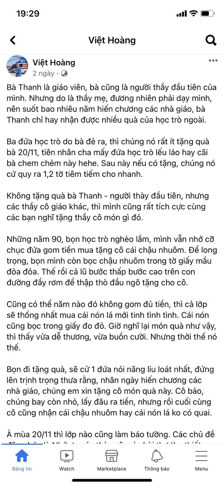 Facebooker Việt Hoàng chợt “giật mình” vì 20/11 quên tặng quà người thầy đầu tiên cũng chính là người mẹ của mình. Anh cũng bồi hồi nhớ lại những năm 90, món quà học trò nghèo gửi tặng thầy cô của mình vô cùng giản dị. Và nay có nhà mạng Reddi với số sim 2011 thay bao lời muốn nói của nhiều thế hệ học trò với thầy cô, với chính kí ức thuở vô tư nhất của đời người thông qua một chương trình đấu giá phi lợi nhuận. Anh viết: “Thuê bao di động mang số cuối 2011 mình nghĩ đó là thông điệp hay. Chắc nó mang ý tưởng của một cậu học trò nào đó như mình. Lăn lộn bao nhiêu năm miu sinh, kiếm sống, có khi quên sạch ngày tháng êm đềm dưới mái trường thơ ấu cùng cô thầy, cùng bè bạn năm xưa”.