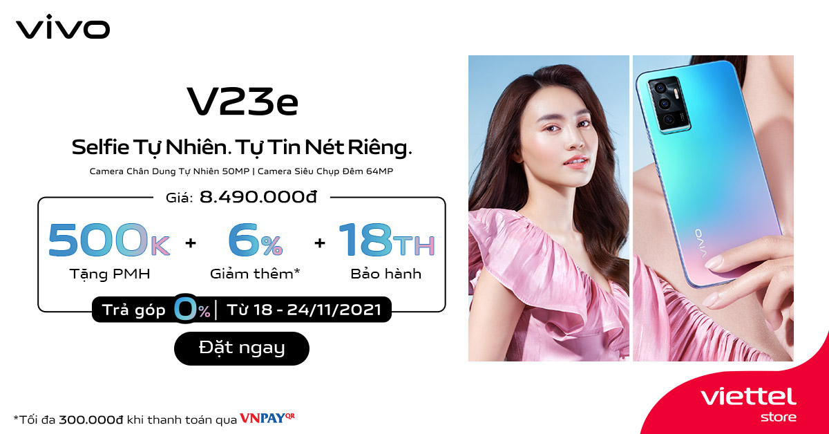Từ nay đến hết 24/11/2021, khách hàng đặt trước vivo V23e tại Viettel Store trên mức giá bán lẻ 8.490.000đ sẽ nhận được combo ưu đãi đặc biệt trên mức giá vốn đã rất cạnh tranh. Cụ thể, khách hàng được tặng ngay phiếu mua hàng 500.000đ và giảm thêm 6%, tối đa 300.000đ khi thanh toán qua VNPAY-QR. Ngoài ra, khách hàng dùng mạng Viettel còn được ưu đãi riêng siêu hấp dẫn khi mua trả góp kèm gói cước V200E (hoặc trợ giá tương đương 3 tháng cước cho các gói Subsidy cam kết 12 tháng, 6 tháng cho gói cam kết 18 tháng).