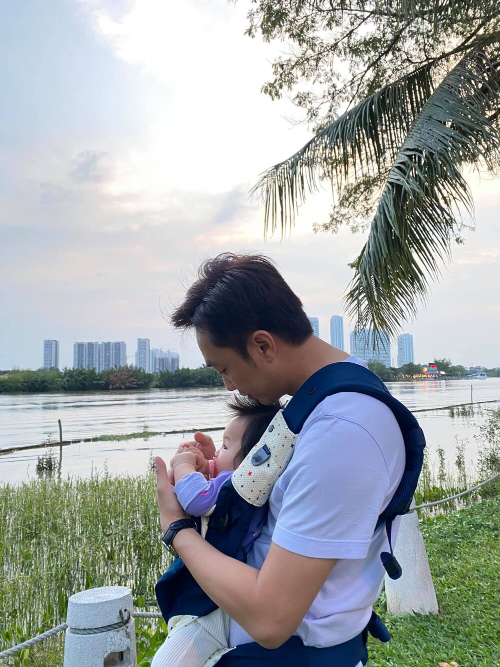Sau những bức ảnh Cường Đô la bế con gái ngắm siêu xe là khoảnh khắc đáng yêu của anh khi vừa địu con vừa cho con bú. Chưa hết, ông bố nghiện còn còn chú thích thêm: “Đủ chuẩn làm bố bỉm không cả nhà”.