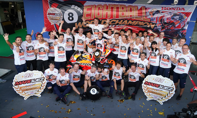 Chặng 15 (diễn ra ngày 6/10/2019 tại trường đua Chang International Circuit, Thái Lan) – Đạt danh hiệu Tay đua vô địch MotoGP 2019: tay đua Marc Marquez # 93 của đội Repsol Honda Team trở thành tay đua vô địch sớm mùa giải MotoGP 2019 với 325 điểm sau chỉ 15 chặng. Đây là danh hiệu vô địch lần thứ tư liên tiếp của Marquez và lần thứ sáu tay đua giành ngôi vô địch MotoGP trong sự nghiệp thi đấu của mình. Marc Marquez hiện đang giữ kỉ lục là nhà vô địch MotoGP trẻ nhất trên thế giới. Hơn nữa, với 420 điểm giành được ở mùa giải năm nay, MM93 đã trở thành tay đua đầu tiên trong lịch sử MotoGP ghi được hơn 400 điểm tại một mùa đấu. Tính đến hết mùa giải MotoGP 2019, Marc Marquez đang giữ kỉ lục 95 lần đứng trên bục podium với 95 chiến thắng (kỷ lục này được ghi nhận là tay đua đội Honda cao thứ 2 trong lịch sử, và tay đua cao thứ 4 trong lịch sử MotoGP).