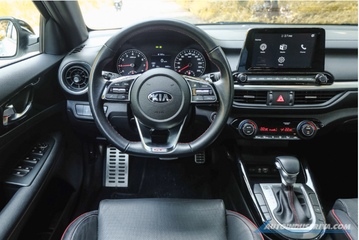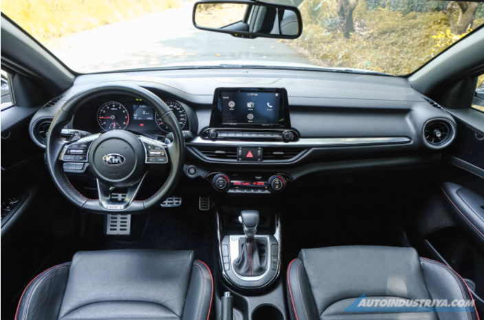 Bên trong nội thất là ghế thể thao, bảng táp-lô, tap-pi cửa và ghế mang nhiều điểm nhấn màu đỏ tạo cảm giác thể thao hơn cho người dùng. Vô lăng của Kia Cerato GT 3 chấu dát phẳng đáy thời thượng. Trung tâm khoang lái là màn hình cảm ứng 8 inch hỗ trợ kết nối Apple CarPlay và Android Auto.