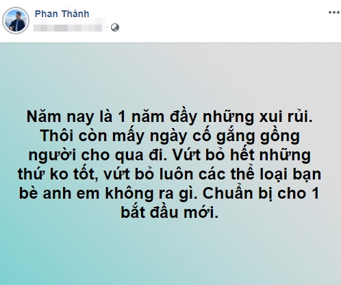 Điển hình là thiếu gia Phan Thành, 2019 là một năm đầy xui rủi đối với anh. Phan Thành chia sẻ: “Năm nay là một năm đầy những xui rủi. Thôi còn mấy ngày, cố gắng gồng người cho qua đi. Vứt bỏ hết những thứ không tốt, vứt bỏ luôn các thể loại bạn bè anh em không ra gì. Chuẩn bị cho một bắt đầu mới”.