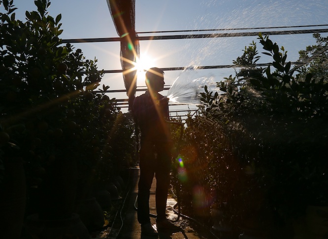 Việc chăm quất bonsai đòi hỏi kỹ thuật và khéo léo hơn rất nhiều so với quất trồng trong vườn. Lượng đất trong chậu ít nên phải tưới nước hợp lý thì cây mới phát triển tốt được. Mỗi ngày, người dân Tứ Liên phải tưới nước cho vườn quất ít nhất 1 lần, tuỳ vào từng giai đoạn của cây.