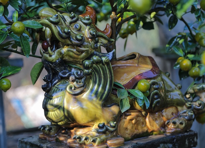 Đây là hình Tỳ Hưu, đầu lân, thân gấu. Toàn thân tỳ hưu được bao bọc bởi một lớp vẩy rồng, trên đầu thì có sừng, lưng có cánh. Do đó tiền chậu tỳ hưu còn đắt hơn cả tiền quất trong chậu.