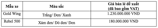 Phiên bản mới mẫu xe Rebel 500 sẽ được bán chính thức ra thị trường từ ngày 11 tháng 02 năm 2022. Trong khi đó, phiên bản mới mẫu xe Gold Wing dự kiến sẽ được bán chính thức từ ngày 27 tháng 02 năm 2022. Cả hai mẫu xe đều được bán thông qua hệ thống Cửa hàng xe Phân khối lớn Honda với chế độ bảo hành 2 năm và không giới hạn kilomet. Mức giá bán lẻ đề xuất như sau: