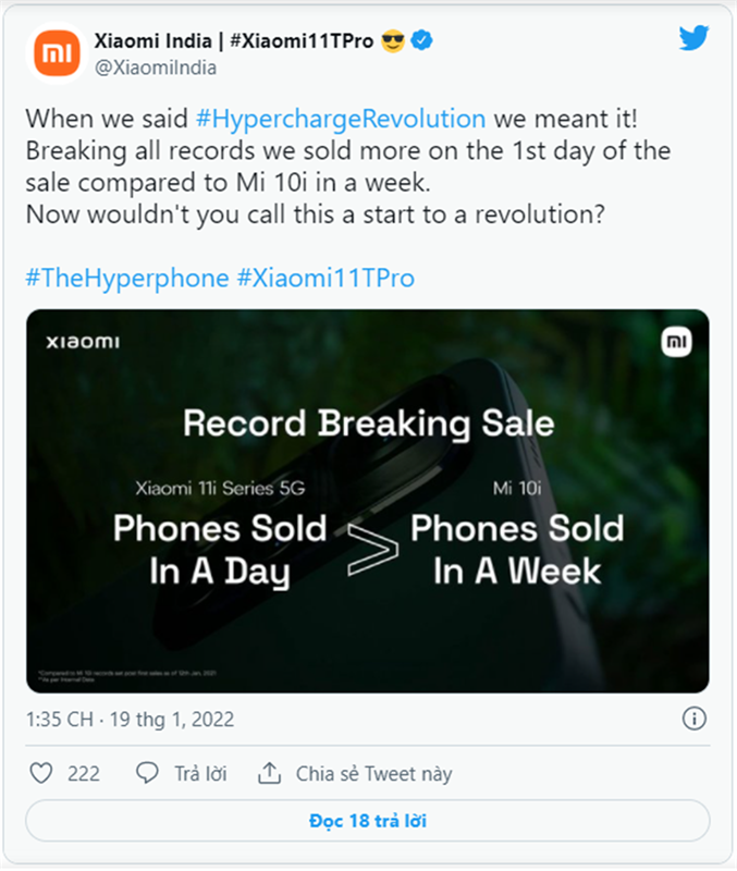 Xiaomi vừa đăng tải một thông tin về Xiaomi 11i trên Twitter. Nội dung bài đăng cho biết Xiaomi 11i vừa lập một kỷ lục mới với doanh số. Mẫu điện thoại này từng được ra mắt tại Trung Quốc với tên gọi Redmi Note 11 hồi tháng 10/2021. Tuy nhiên, nó chỉ thực sự được chú ý kể từ khi lên kệ tại Ấn Độ.