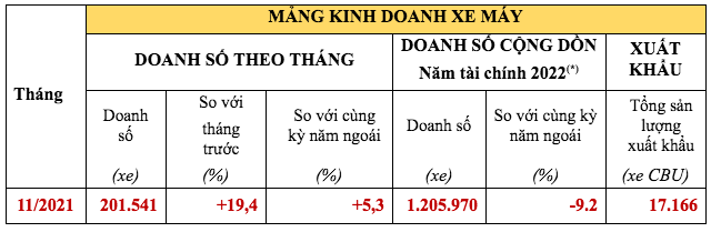 Dòng xe số: Wave Alpha, doanh số đạt 38.405 xe, chiếm 19,1% tổng doanh số bán xe máy của HVN trong tháng 11/2021. Dòng xe ga: Vision, doanh số đạt 49.312 xe, chiếm 24,5% tổng doanh số bán xe máy của HVN trong tháng 11/2021. Dòng xe côn tay: Winner X, doanh số đạt 7.396 xe, chiếm 3,7% tổng doanh số bán xe máy của HVN trong tháng 11/2021.2/ DOANH SỐ BÁN Ô TÔ: 1.990 xe, tăng 51% so với tháng trước, giảm 1,4% so với cùng kỳ năm ngoái. Cụ thể:
