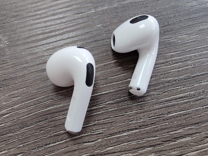 AirPods 3 được lột xác hoàn toàn về mặt thiết kế so với thế hệ trước. AirPods 3 trông thon gọn hơn với hộp sạc thuôn gọn theo chiều ngang. Thân tai nghe được làm ngắn hơn trước, mỗi bên tai nghe chỉ nặng 4,28 gram, hộp sạc nặng 37,91 gram.