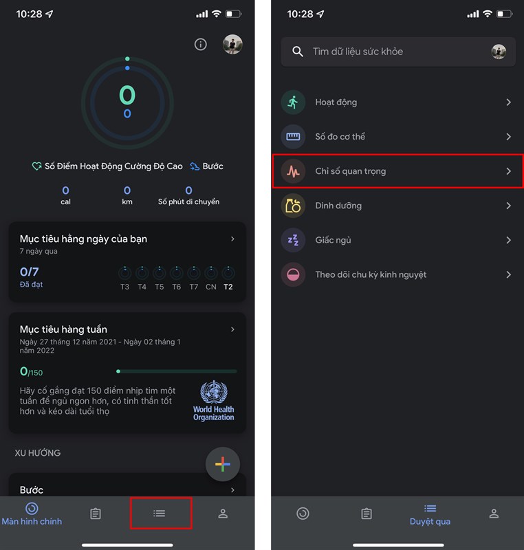 Bước 2: Sau khi tải và cập nhật phiên bản mới của ứng dụng Google Fit bạn mở ứng dụng lên và chọn mục Dữ liệu sức khoẻ -> Chỉ số quan trọng.