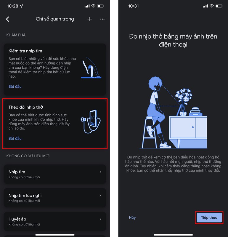 Bước 1: Bạn mở ứng dụng Google Fit lên, chọn mục Dữ liệu sức khoẻ -> Chỉ số quan trọng -> Theo dõi nhịp thở. Nhấp chọn Tiếp theo để đọc hướng dẫn về tính năng.
