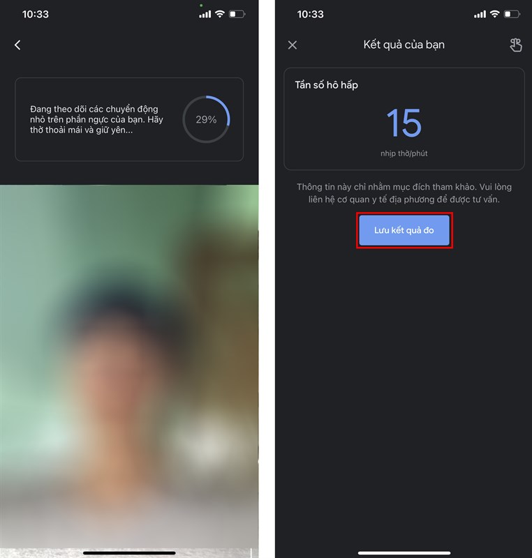 Bước 2: Tiếp theo bạn đặt điện thoại lên một điểm tựa nào đó thật chắc chắn sao cho camera có thể quay được chính mình từ phần thắt lưng trở lên để bắt đầu đo. Sau khi hoàn tất quá trình đó, bạn sẽ nhận được kết quả Tần số hô hấp của mình. Nhấn Lưu kết quả đo là được.