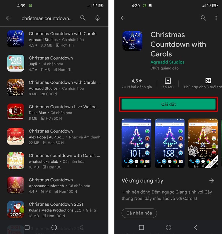 Bước 1: Đầu tiên bạn cài đặt ứng dụng Christmas Countdown with Carols về điện thoại Android của mình tại đây.