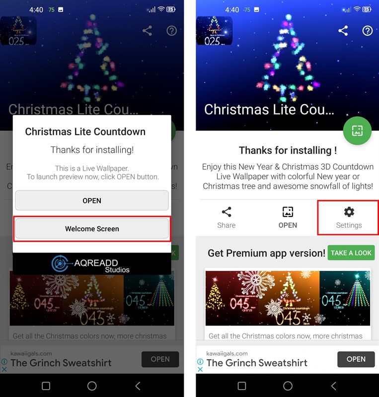 Bước 2: Sau khi tải và cài đặt ứng dụng Christmas Countdown with Carols. Bạn mở ứng dụng lên và chọn Welcome Screen -> Chọn Cài đặt (Settings).