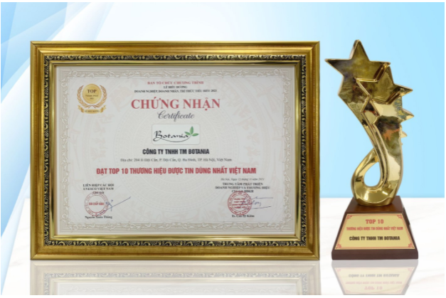 Ngày 13/11/2021, công ty Botania một lần nữa vinh dự nhận giải thưởng “Top 10 Thương hiệu được tin dùng nhất Việt Nam” trong chương trình Lễ biểu dương doanh nghiệp, doanh nhân, trí thức tiêu biểu 2021. Chương trình do liên hiệp các Hội UNESCO Việt Nam; Trung tâm phát triển doanh nghiệp và Thương hiệu thuộc Liên hiệp các Hội khoa học và Kỹ thuật Việt Nam; Liên hiệp khoa học doanh nhân Việt Nam; các Bộ, Ban, Ngành Trung ương phối hợp tổ chức.
