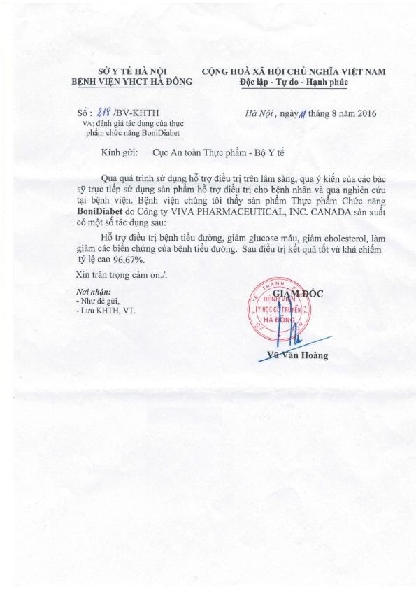 Tiếp tục trong năm 2016, sản phẩm BoniDiabet+ đồng thời được tiến hành nghiên cứu lâm sàng tại bệnh viện Y học cổ truyền Hà Đông bởi Ths.Bs Vũ Văn Hoàng (Giám đốc Bệnh viện) và các bác sĩ khác. Đối tượng nghiên cứu là những bệnh nhân bị tiểu đường ít nhất 1 năm, có thể mắc thêm những nguy cơ như tăng huyết áp và béo phì.
