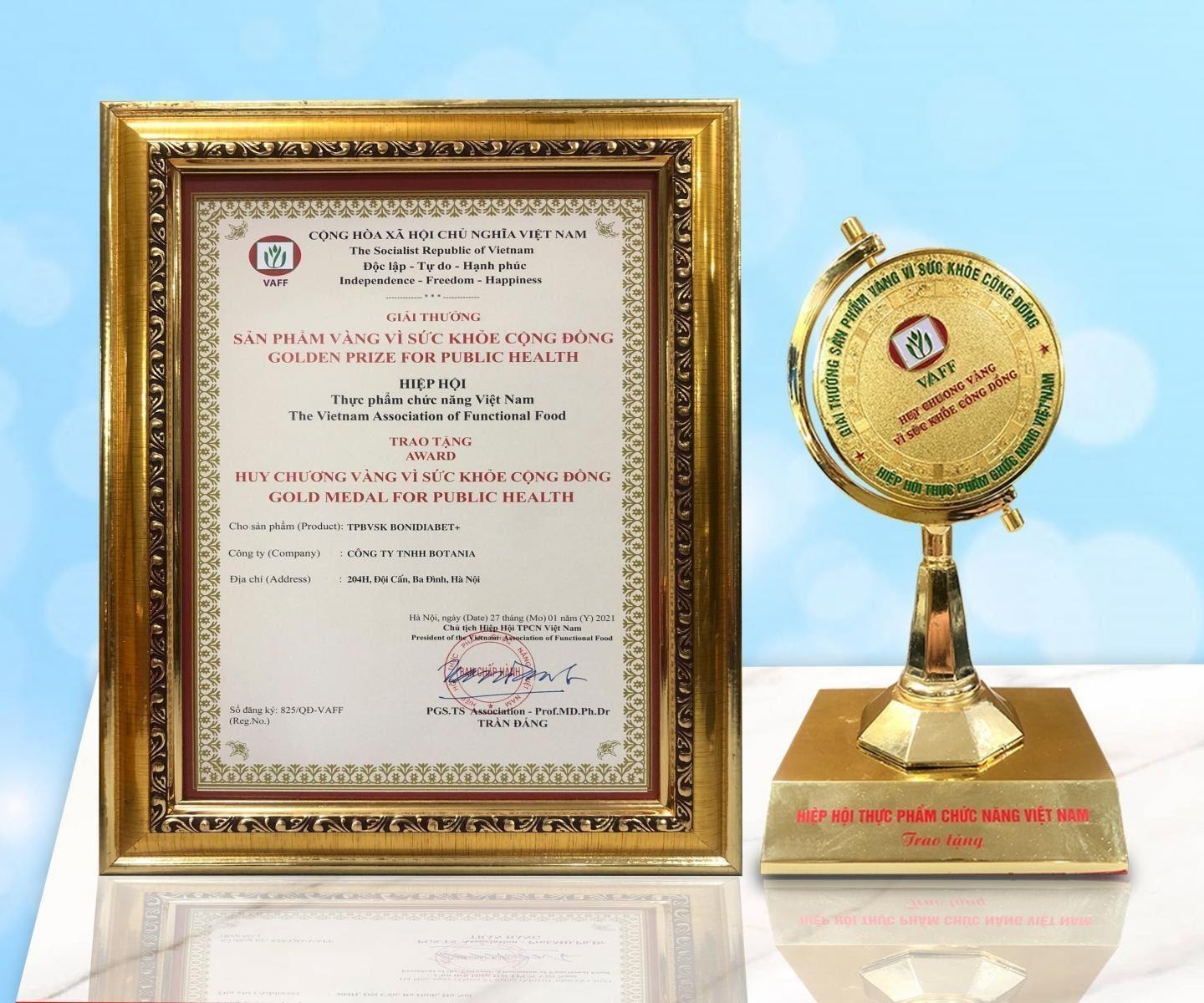 Năm 2014, công ty Botania lần đầu được nhận giải thưởng “Huy chương vàng vì sức khỏe cộng đồng”, cùng với đó là danh hiệu “Sản phẩm vàng vì sức khỏe cộng đồng” cho các sản phẩm như: BoniDiabet+, BoniHappy+, BoniMen, BoniBaio+, BoniSleep+,… Đây là giải thưởng thường niên do Hiệp hội thực phẩm Chức năng Việt Nam (VAFF) trao tặng cho những doanh nghiệp tiêu biểu có đóng góp to lớn cho cộng đồng. Tiếp sau đó, vào năm 2017, 2018, 2019 và 2021, công ty Botania lại tiếp tục nhận được những giải thưởng này. Đây chính là minh chứng cho sự tin tưởng của cộng đồng cho công ty và cũng là động lực để công ty không ngừng cố gắng trong công cuộc chăm sóc sức khỏe toàn dân.Giải thưởng “Huy chương vàng vì sức khỏe cộng đồng” của công ty Botania.