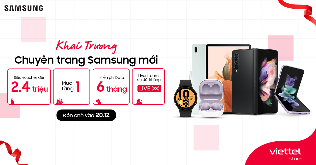 Có gì đáng để đón chờ vào ngày 20/12 – chính thức khai trương chuyên trang Samsung mới? Siêu voucher đến 2.4 triệu, mua 1 tặng 1, miễn phí data 6 tháng, livestream ưu đãi khủng.