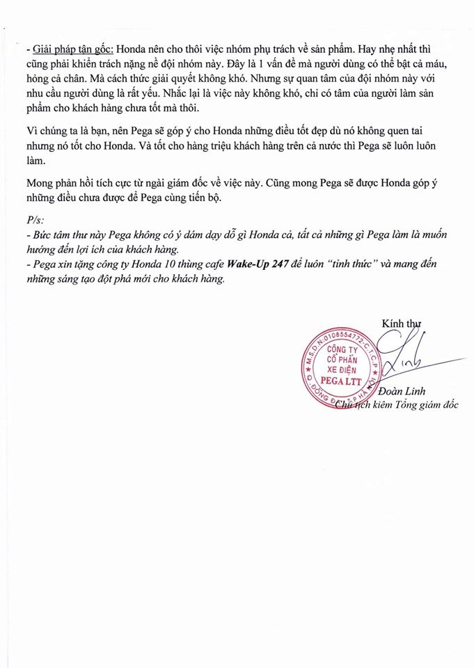 Do đó, CEO PEGA – ông Đoàn Linh đã đề xuất Honda các giải pháp để giải quyết vấn đề mà ông tự đưa ra. Cuối tâm thư ông Linh còn nói thêm: Bức tâm thư này PEGA không có ý dám dạy dỗ gì Honda cả, tất cả những gì PEGA làm là muốn hướng đến lợi ích khách hàng.