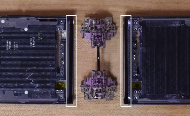 Nếu để ý kỹ trong hình chúng ta có thể thấy hệ thống chổi ngăn bụi của Galaxy Z Flip trong khoanh màu trắng bên dưới. Trông chúng khá sạch sẽ, điều đó có nghĩa nó không thực sự “thần thánh” như những gì mà Samsung quảng cáo.