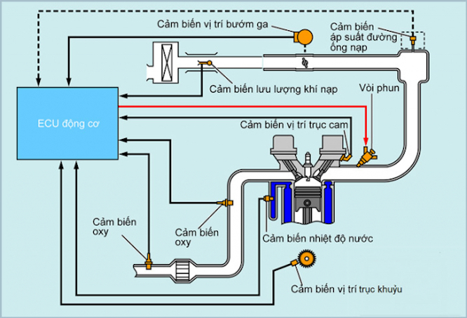 Với công nghệ phun xăng điện tử, bộ phận cảm biến sẽ theo dõi liên tục quá trình hoạt động của động cơ gồm vị trí bướm ga, áp suất ống nạp, nhiệt độ khí nạp, nhiệt độ dầu, tốc độ động cơ…. sau đó sẽ tải thông tin tới bộ phận điều khiển. Lúc này, ECU sẽ dựa trên các con số nhận được từ cảm biến vòng tua, nhiệt độ động cơ, nhiệt độ không khí, vị trí trục khuỷu, vị trí bướm ga…. để lập trình tính toán nhiên liệu và đưa ra tiến hành đóng mở kim phun xăng.