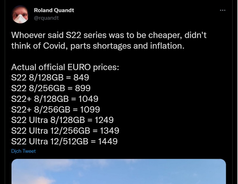 Về giá bán, hiện tại vẫn chưa có giá bán chính thức của Galaxy S22 Ultra. Nhưng một tài khoản @rquandt đã chia sẻ thông tin trên Twitter về giá bán của Galaxy S22 Ultra như sau: