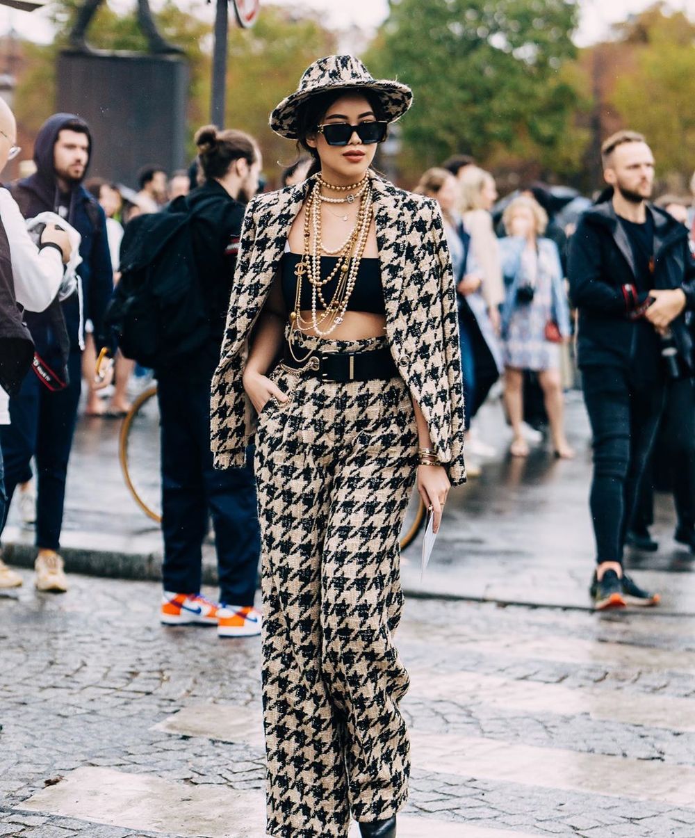 Đây là bộ cánh dự show Chanel của rich kid, người đẹp kết hợp với bộ vest vải tweed, hoạ tiết răng sõi cùng layout vòng cổ và mắt kính đen cũng của nhà mốt Pháp.