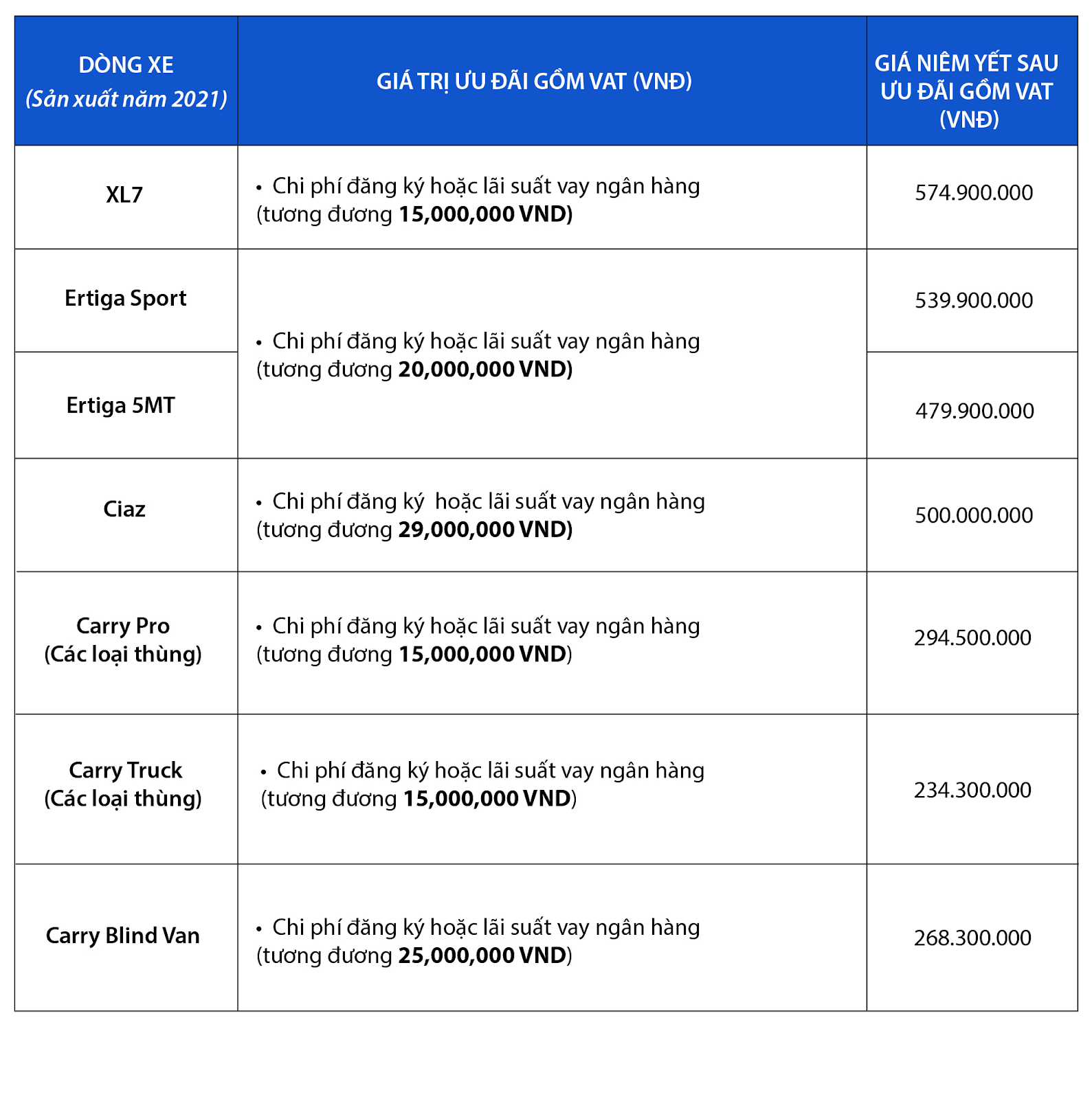 Ngoài XL7, các dòng xe du lịch và thương mại khác cũng được áp dụng gói vay mua xe và khuyến mại lớn. Để biết thêm thông tin chi tiết, vui lòng liên hệ Đại lý Suzuki hoặc hotline 1800 6950 hoặc xem tại: https://suzuki.com.vn/tin-tuc/tin-tuc-o-to/670-de-dang-so-huu-xe-suzuki-voi-chuong-trinh-vay-uu-dai-voi-vpbank