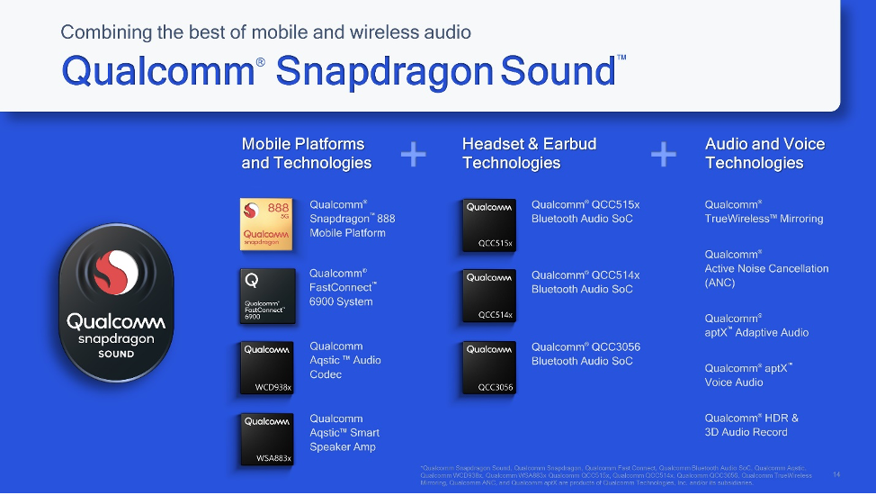 Nền tảng di động Qualcomm Snapdragon 8-series Hệ thống kết nối di động Qualcomm FastConnect 6900 Qualcomm® QCC514x, QCC515x và QCC3056 series Bluetooth Audio SoCs Công nghệ kiểm soát tiếng ồn chủ động Qualcomm Active Noise Cancelling (ANC) Qualcomm aptX Adaptive (tm), 24-bit 96kHz và độ trễ 89ms Giọng nói băng siêu rộng Qualcomm aptX Voice Codec âm thanh Qualcomm Aqstic và bộ khuếch đại loa thông minh WCD938x và WSA883x) Qualcomm Audio và Voice Communication Suite