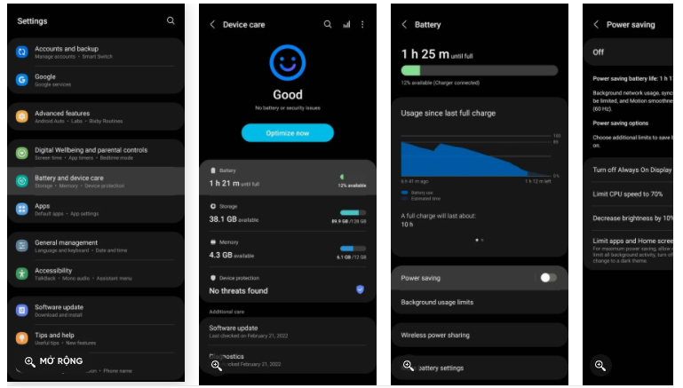 Tắt Luôn Bật Hiển Thị Giới hạn tốc độ CPU tối đa ở mức 70% Giảm độ sáng 10% Giới hạn ứng dụng và màn hình chính (giới hạn hoạt động nền, áp dụng màn hình chính đơn giản hoá, giới hạn các ứng dụng có sẵn và tắt bảng Edge).Bạn có thể bật Chế độ tiết kiệm pin bằng cách vào phần Cài đặt -> Pin và Chăm sóc thiết bị -> Pin -> Tiết kiệm pin. Bạn cũng có thể sử dụng bảng Cài đặt nhanh để bật nhanh hơn.