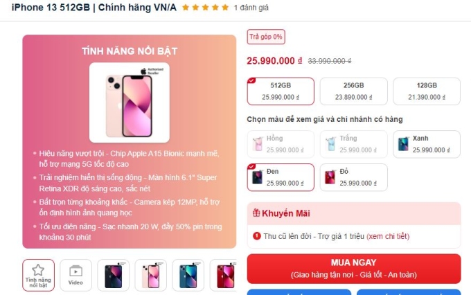 Hiện tại, iPhone 13 đang được bán ra tại các đại lý với giá 25,9 triệu đồng cho iPhone 13 bản 512GB, tức giảm giá 4 triệu đồng so với hồi đầu tháng 3. Như vậy, so với giá niêm yết của sản phẩm tại thời điểm ra mắt (34 triệu đồng) thì iPhone 13 giảm giá tới 8 triệu đồng.