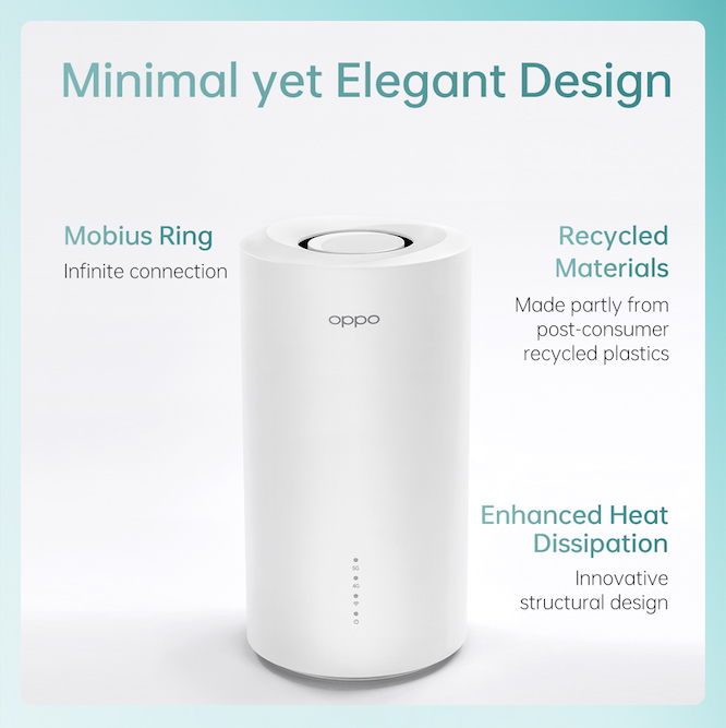 T2 tiếp tục triết lý thiết kế tối giản nhưng đầy tính nghệ thuật của OPPO. Thân hình trụ màu trắng tinh khiết được bao quanh bởi một dải bang mobius, đại diện cho khả năng kết nối không giới hạn do công nghệ CPE mang lại. Kết cấu bề mặt này không chỉ tăng thêm sự sang trọng cho thiết bị mà còn giúp thiết bị chống bụi và chống bẩn tốt hơn. Với thiết kế tối giản này, T2 dễ dàng phù hợp với mọi môi trường nội thất, cho phép người dùng tận hưởng kết nối 5G tốc độ trong một thiết kế đặc biệt đến từ OPPO.