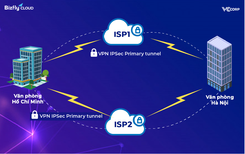 Lấy ví dụ cụ thể như sau: Doanh nghiệp có 1 mạng riêng ở Hà Nội, 1 mạng riêng ở Hồ Chí Minh, và 2 mạng riêng này cần kết nối với nhau để trao đổi dữ liệu, lúc đó sẽ cần đến VPN site to site.