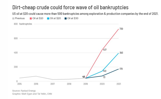 Rystad Energy cho biết, nếu giá dầu ở mức 20 USD/thùng thì tính đến cuối năm 2021 sẽ có 533 công ty sản xuất và khai thác dầu mỏ của Mỹ sẽ phải đệ đơn xin phá sản. Tổ chức này cũng dự báo, nếu giá dầu duy trì ở mức 10 USD/thùng thì hơn 1.100 công ty sẽ phải phá sản.