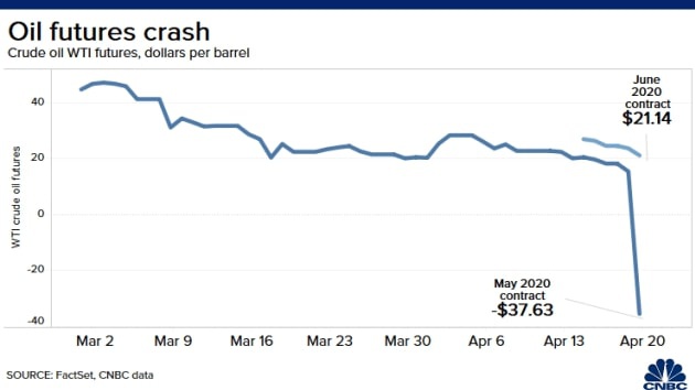 Do ảnh hưởng bởi đại dịch Covid-19, nhiều công ty năng lượng Mỹ đã không còn kho chứa dầu. Trong khi đó, hợp đồng dầu thô giao trong tháng 5 đáo hạn vào ngày 21/4, các nhà đầu tư phải đổ xô bán tháo, tạo áp lực lên giá.