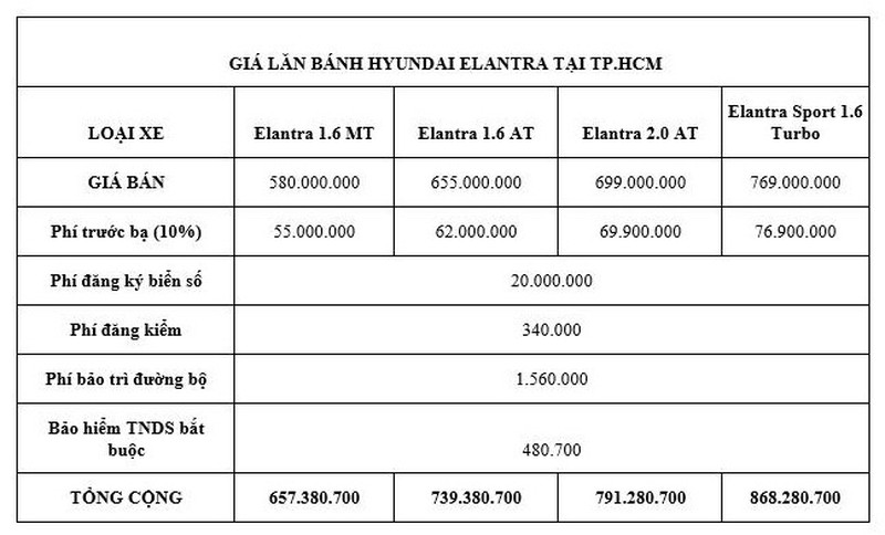 Dưới đây là bảng giá lăn bánh của Hyundai Elantra: