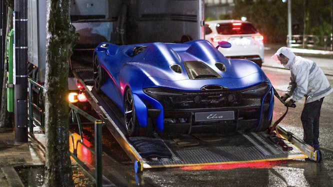 Mới đây, trên mạng xã hội vừa xuất hiện hình ảnh chiếc McLaren Elva màu xanh dương tắm mưa. Dường như xe đang bị chết máy khi có 4-5 người cố gắng đẩy xe tìm một chỗ trú mưa.
