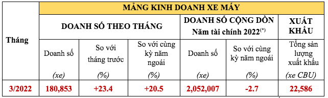 Ở mảng xe máy, trong tháng 3 Honda Việt Nam tiêu thụ 180,853 xe, tăng 23.4% so với tháng trước và tăng 20.5 % so với cùng kỳ năm ngoái, cụ thể: