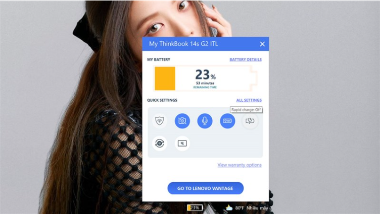 Hiện tại mình đang sử dụng laptop Lenovo để test tính năng này. Và mình có sử dụng phần mềm tên là Lenovo Vantage. Những loại laptop khác cũng sẽ có phần mềm tương tự nên các bạn không phải lo lắng đâu nhé. Bạn chỉ cần vào hình viên pin trên Taskbar và bật tính năng Rapid Charge (sạc nhanh độc quyền của Lenovo) là được. Đây chính là tính năng sạc nhanh trên laptop nha các bạn.