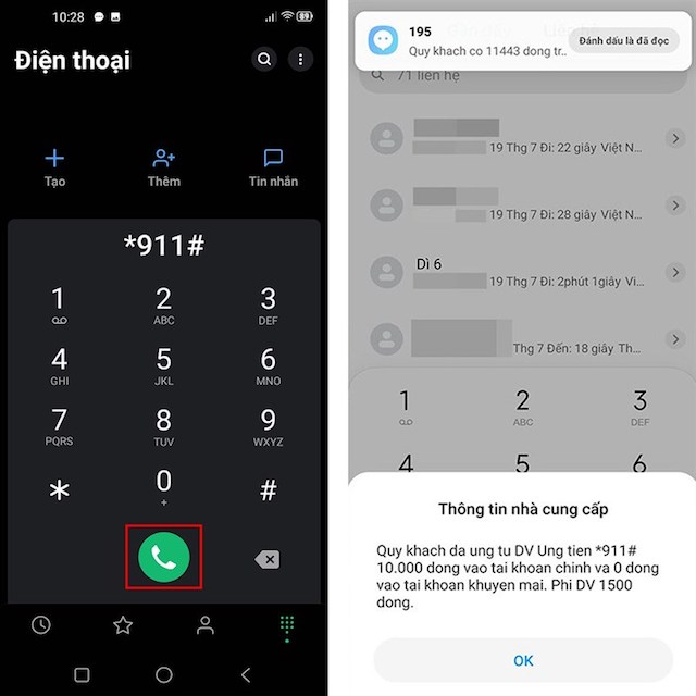 Để ứng tiền theo phương pháp này bạn bấm *911#, sau đó nhấn Gọi. Bạn đợi 1-2 phút sẽ nhận được số tiền ứng là 15.000 đồng/lần. Phí ứng tiền là 2.250 đồng/lần ứng.