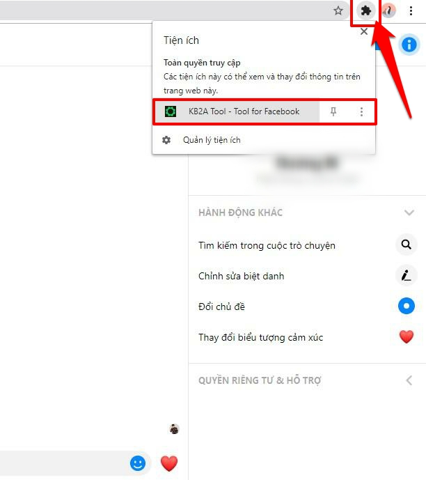 Trường hợp 2: Nếu như nội dung không hiển thị sẵn trong đoạn chat bạn cũng có thể xem lại tin nhắn bằng cách nhấn vào biểu tượng tiện ích nằm ở góc phải phía trên cùng của Chrome -> chọn Tiện ích KB2A Tool – Tool For Facebook.