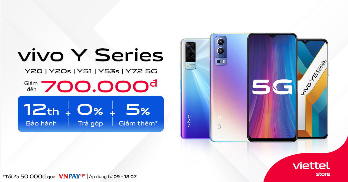 Một số smartphone vivo được đông đảo khách hàng quan tâm kể từ khi ra mắt được áp dụng trong chương trình kể đến như vivo V21 5G, Y72 5G, Y51, Y20s, Y53s... Đặc biệt, vivo V21 5G và vivo Y Series được Viettel Store và vivo giảm ngay tới 700.000đ đi kèm quà tặng và ưu đãi hiện hành, đem lại lợi ích về giá rõ rệt cho khách hàng.